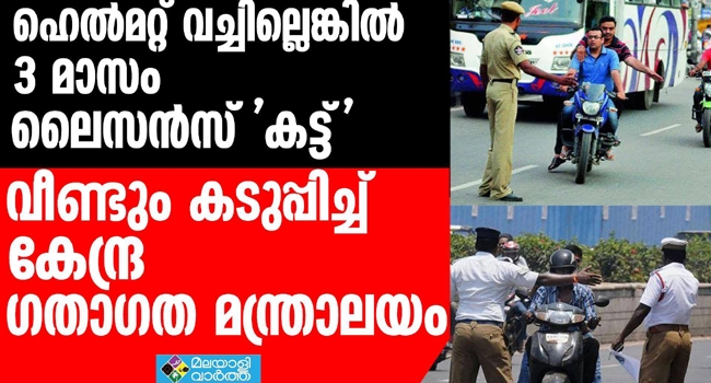 ഗതാഗത നിയമം വീണ്ടും കടുപ്പിച്ചു ഹെല്മറ്റ് വച്ചില്ലെങ്കില് ലൈസന്സ് 'കട്ട്'.... ഗതാഗത നിയമങ്ങളില് ഒരു വിട്ടുവീഴ്ചയ്ക്കും തയ്യാറാകാതെ കേന്ദ്ര ഗതാഗത മന്ത്രാലയം രംഗത്ത്