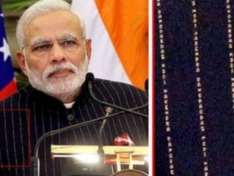 അമേരിക്കന് പ്രസിഡന്റ് ബറാക് ഒബാമയുമായി നടത്തിയ കൂടിക്കാഴ്ചയിലാണു നീല നിറത്തിലുള്ള ബദ്ഗല സ്യൂട്ടില് സ്വര്ണനൂലില് നരേന്ദ്ര ദാമോദര് ദാസ് മോദിയെന്ന് അടിമുടിയെഴുതി മോദി പ്രത്യക്ഷപ്പെട്ടത്. പത്തു ലക്ഷത്തിലേറെ രൂപ വില വരുന്ന ഈ സ്യൂട്ടിന്റെ പകിട്ട് പ്രതിപക്ഷ പാര്ട്ടികളുടെ വിമര്ശനങ്ങളേറ്റ് ഏറെ ചുളുങ്ങിപ്പോയിരുന്നു. ഫേസ് ബുക്ക്, ട്വിറ്റര് തുടങ്ങിയ സോഷ്യല് മീഡിയയിലൂടെ ഏറെ ആക്ഷേപം കേള്ക്കുകയും ചെയ്തു.