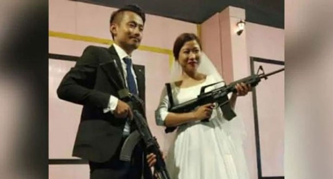 നാഗാലാന്റിലെ എന്എസ്സിഎന് - യു നേതാവ് ബൊഹോതോ കിബയുടെ മകനും വധുവുമാണ് വിവാഹത്തിന് തോക്കുമായി നില്ക്കുന്നത്.