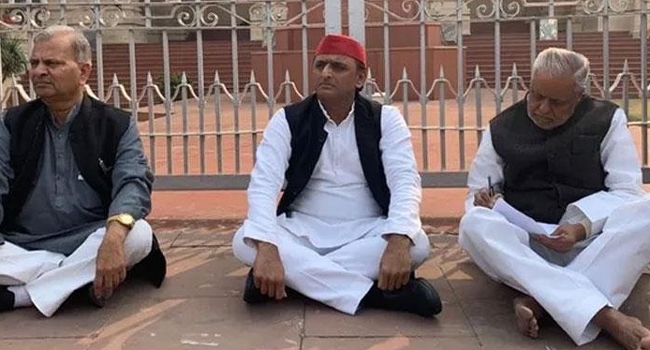 പാര്ട്ടി സംസ്ഥാന നേതാവ് നരേഷ് ഉത്തം പട്ടേല്, രാജേന്ദ്ര ചൗധരി എന്നിവരും അഖിലേഷിനൊപ്പം നിയമസഭക്ക് മുന്നില് കുത്തിയിരിപ്പ് നടത്തി.