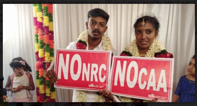 പൗരത്വനിയമഭേദഗതിക്കെതിരായ പ്രതിഷേധം കല്യാണപ്പന്തലിലും; വേറിട്ട പ്രതിഷേധവുമായി വധു വരന്മാർ; ചിത്രങ്ങൾ വൈറലാകുന്നു