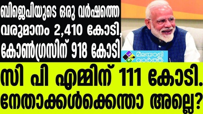 രാജ്യത്തെ ആറ് ദേശീയപാര്ട്ടികള്ക്ക് ലഭിച്ച വരുമാനത്തിന്റെ കണക്കുകള് പുറത്ത്..... ബിജെപിയുടെ ഒരു വര്ഷത്തെ വരുമാനം 2,410 കോടി, കോണ്ഗ്രസിന് 918 കോടി , സി പി എമ്മിന് 111 കോടി, ആറ് പാര്ട്ടികള്ക്കുമായി ഈ സാമ്പത്തിക വര്ഷത്തില് ആകെ ലഭിച്ചത് 3,698.66 കോടി രൂപ