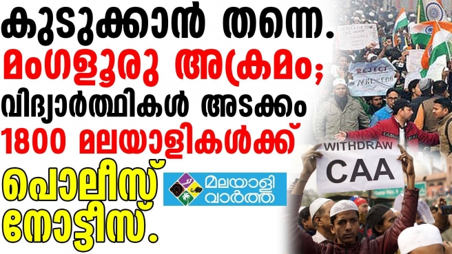 പൗരത്വ ഭേദഗതി നിയമത്തിനെതിരെ ഉയര്ന്ന പ്രതിഷേധെത്ത തുടര്ന്നുണ്ടായ അക്രമങ്ങളുമായി ബന്ധപ്പെട്ട് മംഗളൂരു സ്റ്റേഷനില് ഹാജരാകാന് 1800 മലയാളികള്ക്ക് പൊലീസ് നോട്ടീസ് അയച്ചു. കാസര്കോട്, ഉപ്പള, മഞ്ചേശ്വരം മേഖലയിലെ സ്ത്രീ-പുരുഷ ഭേദമന്യേയുള്ള 1800 പേര്ക്കാണ് മംഗളൂരു സിറ്റി ക്രൈം റെക്കോഡ്സ് ബ്യൂറോ അസി. കമാണ്ടന്റ് ഓഫിസില്നിന്ന് നോട്ടീസ് അയച്ചത്. മഞ്ചേശ്വരത്ത് മാത്രം 400 പേര്ക്ക് നോട്ടീസ് ലഭിച്ചു.