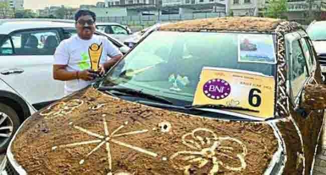 സ്വന്തം കാറില് ചാണകം പൂശി, വാഹന റാലിയില് ഒന്നാം സമ്മാനം നേടി യുവാവ്