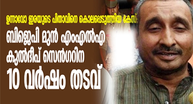 ഉത്തര്പ്രദേശിലെ ഉന്നാവോയില് ബലാല്സംഗത്തിനിരയാക്കിയ യുവതിയുടെ പിതാവിനെ കൊലപ്പെടുത്തിയ കേസില് ബിജെപിയില്നിന്ന് പുറത്താക്കിയ എംഎല്എ കുല്ദീപ് സിങ് സെന്ഗറിന് 10 വര്ഷം തടവ്