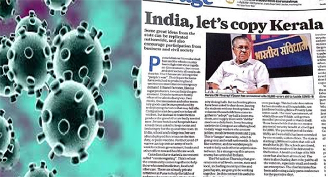 രോഗവ്യാപനം തടയുന്നതിൽ കേരളം സ്വീകരിച്ച മാര്ഗങ്ങള് രാജ്യത്തിന് മാതൃകയാക്കാമെന്ന് വ്യക്തമാക്കുന്നു. ഇന്ത്യ, കേരളത്തെ പകര്ത്തൂ എന്ന തലക്കെട്ടാണ് ലേഖനത്തിന് നൽകിയിരിക്കുന്നത് . കഴിഞ്ഞ ദിവസം മുഖ്യമന്ത്രി വാര്ത്താ സമ്മേളനത്തില് പ്രഖ്യാപിച്ച സാമ്പത്തിക പാക്കേജ് സംബന്ധിച്ച വിവരങ്ങളും ലേഖനത്തിൽ ഉള്പ്പെടുത്തിയിട്ടുണ്ട്. മുന് എംപി എം ബി രാജേഷ് ലേഖനം ഫേസ്ബുക്കിലൂടെ പങ്കുവെച്ചു.