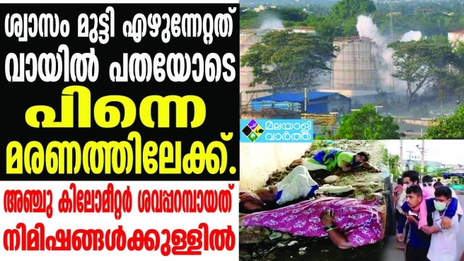 ആന്ധ്രാപ്രദേശിലെ വിശാഖപട്ടണത്തുണ്ടായ വിഷവാതക ചോര്ച്ചയില് രണ്ട് മുതിര്ന്ന പൗരന്മാരും 8 വയസുള്ള പെണ്കുട്ടിയുമടക്കം എട്ട് മരണം, പുലര്ച്ചെ മൂന്നുമണിയോടെയാണ് വിഷവാതക ചോര്ച്ചയുണ്ടായത്, ശ്വാസതടസം, കണ്ണെരിച്ചില് തുടങ്ങിയ അസ്വസ്ഥതകള് അനുഭവപ്പെട്ടതോടെ ആളുകള് വീടുകളില്നിന്നു പുറത്തേക്ക് ഇറങ്ങിയോടാന് തുടങ്ങി, പലരും വഴിയില് വീണതായി റിപ്പോര്ട്ട് ,5,000 ത്തോളം പേര് ആശുപത്രിയില്