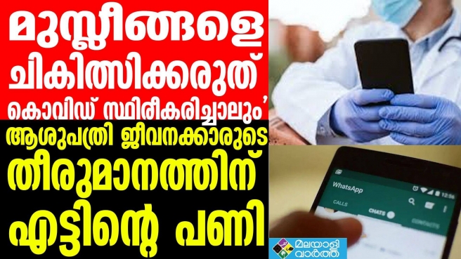 മുസ്ലീങ്ങളെ ചികിത്സിക്കരുത് കൊവിഡ് സ്ഥിരീകരിച്ചാലും'.... ആശുപത്രിയില് എത്തുന്ന മുസ്ലീങ്ങള്ക്ക് ചികിത്സ നിഷേധിക്കണമെന്നാവശ്യപ്പെട്ട് വാട്സാപ്പ് ഗ്രൂപ്പില് ചാറ്റിംഗ് നടത്തിയ സംഭവത്തില് പൊലീസ് കേസെടുത്ത് അന്വേഷണം ആരംഭിച്ചു
