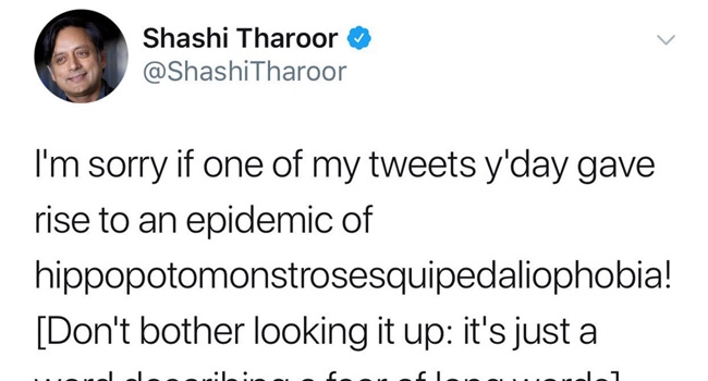 ഹിപ്പോപൊട്ടോമോണ്സ്ട്രോസെസ്ക്വിപ്പെഡാലിയോഫോബിയ..'; സോഷ്യൽ മീഡിയയെ ഞെട്ടിച്ച് വീണ്ടും തരൂര്; തന്റെ ഇംഗ്ലീഷ് ഉച്ചാരണത്തെ അനുകരിച്ചുകൊണ്ട് സാമൂഹ്യമാധ്യമങ്ങളില് പ്രചരിച്ച വീഡിയോയ്ക്ക് പ്രതികരണമായി ചെയ്ത ട്വീറ്റിലാണ് തരൂരിന്റെ ഏറ്റവും പുതിയ ഭാഷാപ്രയോഗം