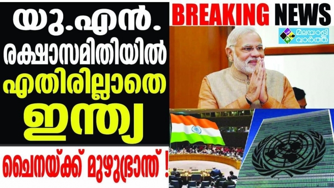 ഐക്യരാഷ്ട്ര സഭയുടെ രക്ഷാസമിതിയിലേക്ക് ഇന്ത്യ എതിരില്ലാതെ തെരഞ്ഞെടുക്കപ്പെട്ടു. രക്ഷാസമിതിയിലേക്ക് രണ്ട് വര്ഷത്തേയ്ക്കുള്ള താല്കാലിക അംഗത്വമാണ് ഇന്ത്യക്ക് ലഭിച്ചത്.193 അംഗ ജനറല് അസംബ്ലിയില് 184 വോട്ടുകള് നേടി എതിരില്ലാതെയാണ് ഇന്ത്യ തെരഞ്ഞടുക്കപ്പട്ടത്.