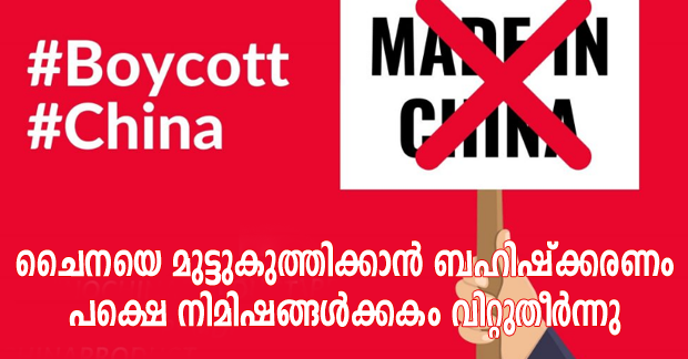 മേഡ് ഇന് ചൈന ഉപേഷിക്കൂ അവരെ മുട്ടുകകുത്തിക്കൂ... രാജ്യത്താകമാനം ചൈന വിരുദ്ധ പ്രചാരണം ശക്തം; ചൈനയെ ബഹിഷ്കരിക്കുകയെന്ന ആഹ്വാനം സമൂഹമാധ്യമങ്ങളില് സജീവം; അതിനിടെ മൊബൈലിന്റെ കുത്തകക്കാരായ ചൈനക്കാര് ചൂടപ്പം പോലെ എല്ലാം വിറ്റു തീര്ത്തു
