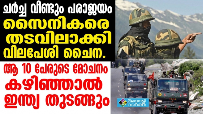 ചര്ച്ച വീണ്ടും പരാജയം സൈനികരെ തടവിലാക്കി ചൈന....ഇവരെ ഉപയോഗിച്ച് വിലപേശി അതിര്ത്തിയിലെ തര്ക്ക മേഖലകളില് ആധിപത്യമുറപ്പിക്കാന് ചൈന ശ്രമിച്ചുവെന്നു സൂചന,സേനാംഗങ്ങളെ തടവില് വയ്ക്കുന്നത് ഏറ്റുമുട്ടലിലേക്കു നീങ്ങുമെന്ന് ഇന്ത്യയുടെ മുന്നറിയിപ്പ്