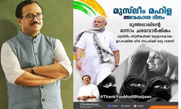 ഇന്ത്യയുടെ ചരിത്രത്തിലെ സുപധാന ദിനം; നരേന്ദ്ര മോദി സര്ക്കാര് മുത്തലാഖ് നിയമം കൊണ്ടുവന്നിട്ട് ഇന്ന് ഒരു വര്ഷം, ഈ ദിനം മുസ്ലീം മഹിള അവകാശ ദിനമായി ആചരിക്കുകയാണ് ഇന്ന് രാജ്യമെന്ന് മുരളീധരൻ