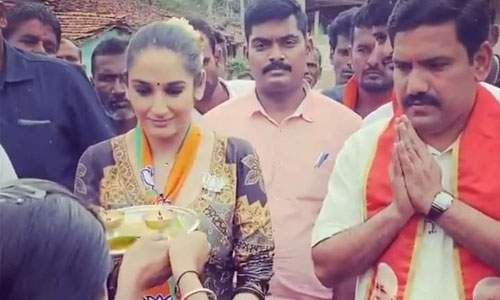 യെഡിയിരൂപ്പ മന്ത്രിസഭയില് അംഗമായ കെ സി നാരായണ ഗൗഡയോടൊപ്പം പ്രചാരണ പരിപാടികളില് പങ്കെടുക്കുന്ന താരത്തിന്റെ ചിത്രങ്ങളാണ് ഇപ്പോള് പ്രചരിക്കുന്നത്.