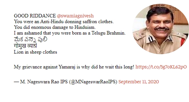 അഗ്നിവേശ് തെലുങ്ക് ബ്രാഹ്മണനായി ജനിച്ചതില് തനിക്ക് ലജ്ജ തോന്നുന്നുവെന്നും ആട്ടിന് തോലിട്ട ചെന്നായയാണ് അദ്ദേഹമെന്നും നാഗേശ്വര റാവു ട്വീറ്റ് ചെയ്തു. സ്വാമി അഗ്നിവേശ് ഹിന്ദു വിരുദ്ധനായിരുന്നുവെന്നും അദ്ദേഹത്തെ കാലന് നേരത്തെ വിളിക്കാതിരുന്നത് എന്തുകൊണ്ടാണെന്നും നാഗേശ്വര റാവുവിന്റെ ട്വീറ്റില് കുറിച്ചിരുന്നു. റാവുവിന്റെ വിദ്വേഷ പരാമര്ശത്തിനെതിരെ വ്യാപക പ്രതിഷേധം ഉയര്ന്നിരുന്നു.
