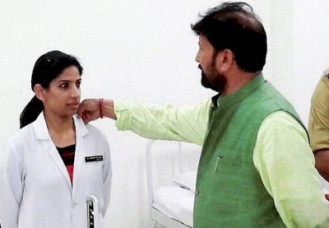 വനിതാ ഡോക്ടറിന്റെ കോളര് ശരിയാക്കുന്ന ജമ്മുകാശ്മീര് മന്ത്രിയുടെ ചിത്രം വൈറലാകുന്നു