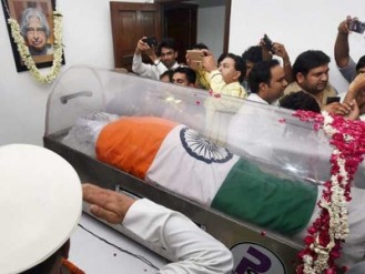 ഉച്ചയ്ക്ക് പന്ത്രണ്ടരയോടെ ഡല്‍ഹിയില്‍ എത്തിച്ച കലാമിന്റെ മൃതദേഹം ഇപ്പോള്‍ ഡല്‍ഹിയിലെ രാജാജി മാര്‍ഗിലെ വസതിയില്‍ പൊതുദര്‍ശനത്തിന് വച്ചിരിക്കുകയാണ്. പൊതുജനങ്ങള്‍ അടക്കം നൂറുകണക്കിനാളുകള്‍ വസതിയില്‍ എത്തി കലാമിന് ആദരാഞ്ജലികള്‍ അര്‍പ്പിച്ചു കൊണ്ടിരിക്കുകയാണ്. ഇന്ന് രാത്രി വരെ പൊതുദര്‍ശനം നീളുമെന്നാണ് റിപ്പോര്‍ട്ട്. മൃതദേഹം നാളെ രാവിലെ ഡല്‍ഹിയില്‍ നിന്ന് രാമേശ്വരത്തേക്ക് കൊണ്ടുപോകും.\"\"