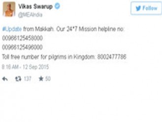 മക്ക അപകടത്തില് ഉള്പ്പെട്ട ഇന്ത്യക്കാരുടെ വിവരങ്ങള് ലഭിക്കുന്നതിനായി ഹെല്പ്പ് ലൈന് നമ്പര് സംവിധാനം ഒരുക്കിയതായി വിദേശകാര്യ മന്ത്രാലയം അറിയിച്ചു. 24 മണിക്കൂര് പ്രവര്ത്തിക്കുന്ന രണ്ടു നമ്പറുകളാണു വിവരങ്ങള് നല്കുന്നതിനായി ക്രമീകരിച്ചിട്ടുള്ളത്. 00966125458000, 00966125496000 എന്നീ നമ്പറുകളില് വിളിച്ചാല് ഹജ്ജിനു പോയിട്ടുള്ള ഇന്ത്യക്കാരുടെ വിവരങ്ങള് ലഭ്യമാകുമെന്നും വിദേശകാര്യ മന്ത്രാലയ വക്തവ് വികാസ് സ്വരൂപ് അറിയിച്ചു. സൗദിയില് നിന്നുള്ളവര്ക്കു പ്രാദേശികമായി വിവരങ്ങള് അറിയുന്നതിനായി 8002477786 എന്ന നമ്പറില് വിളിക്കുവാനുള്ള സൗകര്യവും മന്ത്രാലയം ഏര്പ്പെടുത്തിയിട്ടുണ്ട്.