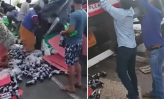റോഡരികില് മറിഞ്ഞുകിടക്കുന്ന ലോറിക്ക് ചുറ്റും ചിതറിക്കിടക്കുന്ന ശീതളപാനീയ കുപ്പികള് ശേഖരിക്കാന് ആളുകള് തിക്കിത്തിരക്കുന്നത് ദൃശ്യങ്ങളില് കാണാം. പരിക്കേറ്റ ഡ്രൈവറെ സഹായിക്കാനോ ആശുപത്രിയിലെത്തിക്കാനോ തയ്യാറാകാതെ, കിട്ടാവുന്നത്ര കുപ്പികള് സ്വന്തമാക്കാനായിരുന്നു അവിടെ തടിച്ചുകൂടിയവരുടെ ശ്രമം. വാഹനത്തിന് അടുത്തേക്ക് ഓടിയെത്തുന്ന ആളുകള് കുപ്പികളുമായി സ്ഥലം വിടുന്നതും ദൃശ്യങ്ങളിലുണ്ട്.