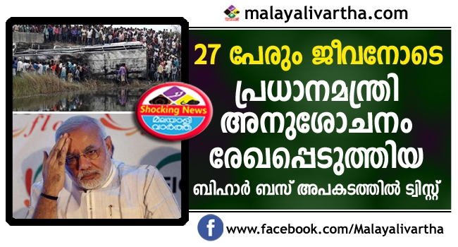 ബിഹാറില് ബസ് അപകടത്തില് 27 പേര് മരിച്ചെന്ന വാര്ത്ത വ്യാജം. ബിഹാറില് മോത്തിഹാരിക്കു സമീപം ബസ് അപകടത്തില്പ്പെട്ട് 27പേര് കൊല്ലപ്പെട്ടെന്ന് വ്യാഴയ്ച വൈകിട്ടോടെയാണ് ദുരന്തനിവാരണ വകുപ്പ് മന്ത്രി ദിനേശ് ചന്ദ്ര യാദവ് ഔദ്യോഗികമായി മാധ്യമങ്ങളെ അറിയിച്ചത്. ഇതനുസരിച്ച് പ്രധാനമന്ത്രി അനുശോചനം രേഖപ്പെടുത്തിയിരുന്നു.