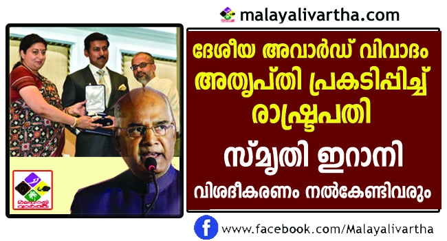 ദേശീയ ഫിലിം അവാര്ഡ് ദാന ചടങ്ങ് വിവാദമാക്കിയതില് കടുത്ത അതൃപ്തി പ്രകടിപ്പിച്ച് രാഷ്ട്രപതി 55 അവാര്ഡ് ജേതാക്കള് ചടങ്ങ് ബഹിഷ്ക്കരിക്കാനിടയായതും രാഷ്ട്രപതി ഭവനെ വിവാദത്തില് വലിച്ചിഴച്ചതിലെ അതൃപ്തി രാഷട്രപതി പ്രധാനമന്തി ഓഫീസിനെയും അറിയിച്ചിട്ടുണ്ട്. വകുപ്പ് മന്ത്രി സ്മൃതി ഇറാനി രാഷട്രപതിയെ നേരിട്ട് കണ്ട് വിശദീകരണം നല്കുമെന്നാണ് സൂചന.