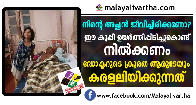 ‘നിന്റെ അച്ഛനെ ജീവനോടെ വേണമെങ്കില് ഈ കുപ്പി ഉയര്ത്തിപ്പിടിച്ചുകൊണ്ട് നില്ക്കണം. ഇവിടെ ഡ്രിപ്പ് സ്റ്റാന്റ് ഇല്ല. കുപ്പി താഴ്ത്തിയാല് ആളു പോക്കാണ്’. എന്ന് ഒരു മകളോട് ഡോക്ടര് പറഞ്ഞാല് ആ കുഞ്ഞ് അതനുസരിക്കാതിരിക്കുമോ. ഡോകടര് പറഞ്ഞത് 7 വയസ്സുള്ള അവള് അക്ഷരം പ്രതി അനുസരിച്ചു. രണ്ടു മണിക്കൂര് ഒരേ നില്പ്പ്.