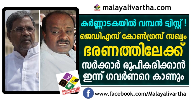 അപ്രതീക്ഷിത രാഷ്ട്രീയ നീക്കങ്ങൾക്കൊടുവിൽ കർണ്ണാടകയിൽ ജെഡിഎസ്– കോൺഗ്രസ് സഖ്യം ; തിരഞ്ഞെടുപ്പ് ഫലം അംഗീകരിക്കുന്നതായി സിദ്ധരാമയ്യ ; സർക്കാർ രൂപീകരിക്കാൻ അവകാശവാദം ഉന്നയിച്ച് ജെഡിഎസ്– കോൺഗ്രസ് സഖ്യം ഇന്ന് ഗവർണറെ കാണും