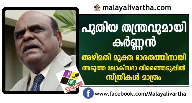 ആന്റി കറപ്ഷന് ഡൈനമിക് പാര്ട്ടിയുമായി മുന് ജസ്റ്റിസ് സി.എസ്. കര്ണന് ; അഴിമതി മുക്ത ഭാരതത്തിനായി സ്ത്രീകളെ സ്ഥാനാര്ത്ഥികളാക്കി അടുത്ത ലോക്സഭ തെരഞ്ഞെടുപ്പില് മത്സരിക്കും ; 2019-20 മുസ്ലിം വനിതയും 2021-22 ല് ഉന്നതജാതിയില്പെട്ട വനിതയെയും അടുത്ത വര്ഷം പിന്നോക്ക ജാതിയില്പെട്ട സ്ത്രീയെയും മന്ത്രി സ്ഥാനത്ത് എത്തിക്കുമെന്ന് വാഗ്ദാനം