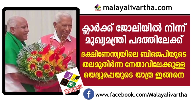 തന്റെ നാലാം വയസ്സില് തന്നെ അമ്മയെ നഷ്ടപ്പെട്ട് ജീവിതത്തില് ഒറ്റപ്പെട്ടു; കോളേജ് കാലത്തു തന്നെ ആര്എസ്എസിലെ സജീവപ്രവര്ത്തകനായിരുന്നു ബി.എസ്. യെഡിയൂരപ്പ; ഏറെ നാടകീയതയ്ക്കൊടുവില് രാജ്ഭവന് അങ്കണത്തില് യദ്യൂരപ്പ മുഖ്യമന്ത്രിയായി സത്യപ്രതിജ്ഞ ചെയ്തു; യെഡിയൂരപ്പയുടെ വളര്ച്ച ഇങ്ങനെ