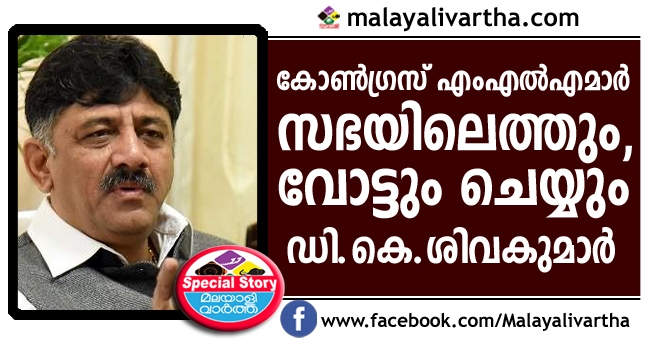 നിലപാട് വ്യക്തമാക്കാതെ ഒളിവില് കഴിയുന്ന എംഎല്എമാര് സഭയിലെത്തും ; കോണ്ഗ്രസിനു തന്നെ വോട്ട് ചെയ്യുമെന്ന് ഡി.കെ.ശിവകുമാര്