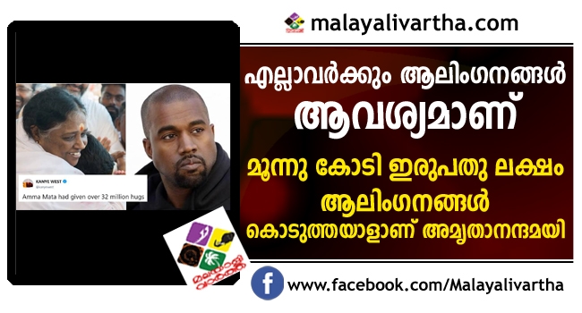 കിം കര്ദഷ്യാന്റെ ഭര്ത്താവ് കന്യെ വെസ്റ്റ് പറയുന്നു മൂന്നു കോടി ഇരുപത് ലക്ഷം ആലിംഗനങ്ങള് കൊടുത്തയാളാണ് അമൃതാനന്ദമയി; പോസ്റ്റിന്റെ പൊരുൾ തേടി ആരാധകരും