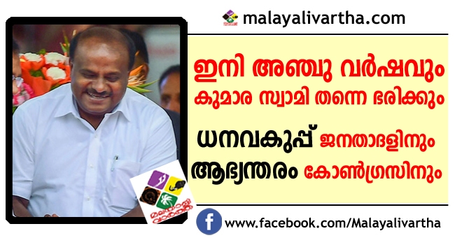 കർണാടക ഇനിയുള്ള അഞ്ചു വർഷം കുമാര സ്വാമിയുടെ കൈയ്യിൽ ; ധനവകുപ്പ് ജനതാദളിനും ആഭ്യന്തരം കോണ്ഗ്രസിനും ; 2019ല് നടക്കുന്ന ലോകസഭാ തിരഞ്ഞെടുപ്പിലും കോണ്ഗ്രസും ജെഡിഎസും കൈകോർക്കും