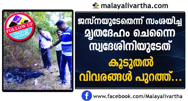 ചെങ്കല്പേട്ടിന് സമീപം പഴവേലിയില് കത്തിക്കരിഞ്ഞ നിലയില് കണ്ടെത്തിയ ജഡം ജസ്നയുടേതല്ലെന്ന് സ്ഥിരീകരണം, മൃതദേഹം ചെന്നൈ സ്വദേശിനിയുടേത്, ബന്ധുക്കളെത്തി മൃതദേഹം തിരിച്ചറിഞ്ഞു