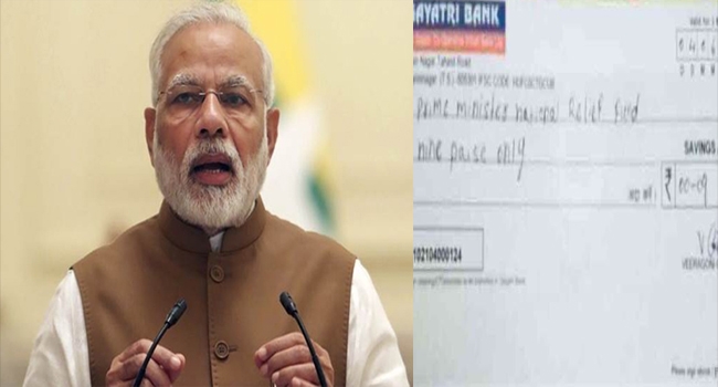 ജനങ്ങളുടെ കണ്ണില് പൊടിയിടാന് കുറച്ച 9 പൈസ പ്രധാനമന്ത്രിയുടെ ദുരിതാശ്വാസനിധിയിലേക്ക് സംഭാവന ചെയ്തിരിക്കുകയാണ് ഇയാള്. പ്രജവാണി പരിപാടിക്കിടെ ജില്ലാ കലക്ടര്ക്ക് ഇയാള് 9 പൈസയുടെ ചെക്ക് കൈമാറി.