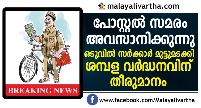 രാജ്യത്തെ ഗ്രാമീണ ഡാക് സേവകുമാരുടെ ശമ്പളം പരിഷ്കരിക്കാന് കേന്ദ്ര മന്ത്രിസഭാ തീരുമാനം. കേന്ദ്ര സര്ക്കാര് ജീവനക്കാരുടെ മാതൃകയില് ക്ഷാമബത്തയും ഇവര്ക്ക് അനുവദിക്കും. തസ്തിക ബ്രാഞ്ച് പോസ്റ്റ് മാസ്റ്റര് ,അസിസ്റ്റന്റ് പോസ്റ്റ് മാസ്റ്റര് എന്നാക്കി മാറ്റും. ബ്രാഞ്ച് പോസ്റ്റ്മാസ്റ്റര്ക്ക് കുറഞ്ഞത് 12,000 രൂപയും, അസിസ്റ്റന്റ് ബ്രാഞ്ച് പോസ്റ്റ് മാസ്റ്റര്ക്ക് 10,000 രൂപയുമായിരിക്കും ശമ്പളം.