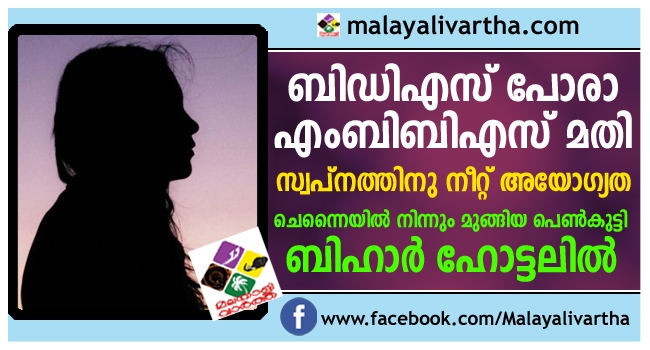കഴിഞ്ഞ വര്ഷം നീറ്റ് പരീക്ഷ എഴുതിയപ്പോൾ ബിഡിഎസ് പ്രവേശനത്തിന് അര്ഹത നേടിയിരുന്നു... എന്നാൽ ലക്ഷ്യത്തിലെത്താൻ അത് വേണ്ടന്ന് വച്ചു; എംബിബിഎസിനായി വീണ്ടും എഴുതി... പക്ഷെ എട്ടുനിലയിൽ പൊട്ടിയതോടെ പെൺകുട്ടി നാടുവിട്ടു; പിന്നെ വീട്ടുകാർ പൊക്കിയത് ബിഹാറിൽ നിന്നും