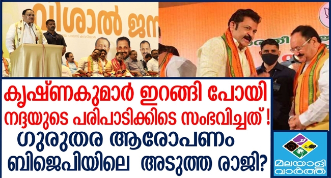 ബിജെപി ദേശീയ അദ്ധ്യക്ഷൻ പങ്കെടുത്ത ചടങ്ങിൽ താരപ്രചാരകനായ നടൻ കൃഷ്ണകുമാറിന് ഇടം നൽകിയില്ലെന്ന് പരാതി; പരിപാടിക്കെത്തി സദസിലിരുന്ന കൃഷ്ണകുമാർ പരിപാടി തീരും മുന്നെ മടങ്ങിപ്പോയി