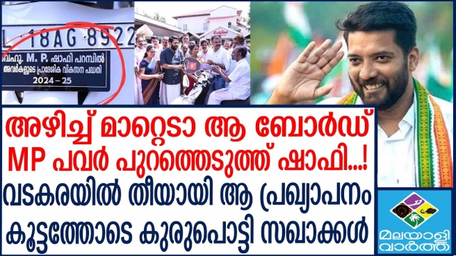 ‘നമ്പർ പ്ലേറ്റ് മാത്രം മതി.. എംപി ബോർഡ് വണ്ടിയിൽ വെച്ചിട്ട് ഓടേണ്ട. ഉദ്യോഗസ്ഥർ അവരുടെ നടപടിക്രമത്തിൻറെ ഭാഗമായി വെച്ചതാണ് ബോർഡ്. ഇന്നുതന്നെ ഊരിവെച്ചോളു... ഇത് നിങ്ങളുടെ വണ്ടിയാണ്.’ ഷാഫി പറമ്പിൽ എംപി പറഞ്ഞു.