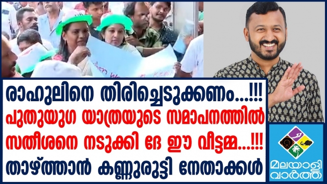 നാം കേരളത്തെ വീണ്ടെടുക്കുമ്പോൾ രാഹുൽ മാങ്കൂട്ടത്തിനിലിനെയും വീണ്ടെടുക്കും. പുതുയുഗ സമാപന സമ്മേളനത്തിൽ പോസ്റ്ററുമായി ഒരു കോൺഗ്രസ് പ്രവർത്തക .പിന്നാലെ സദസിൽ ഉണ്ടായിരുന്ന മറ്റു ചില നേതാക്കൾ അത് കാണുകയും താഴ്ത്തി വയ്ക്കാൻ ആവശ്യപ്പെടുകയുമായിരുന്നു ചെയ്യ്തത്. പിന്നാലെ ആ കോൺഗ്രസ് പ്രവർത്തക അല്പം അമർഷത്തോടെ ആ പോസ്റ്റർ താഴ്ത്തുകയും ചെയ്തു. രാഹുലിനെ പാർത്തിയിലേക്ക് തിരിച്ചെടുക്കണം എന്ന ആവശ്യം പാർട്ടിക്കുള്ളിലെ വനിതാ പ്രവർത്തകർ തന്നെ ആവശ്യപ്പെടുകയാണ് ചെയ്തത്.