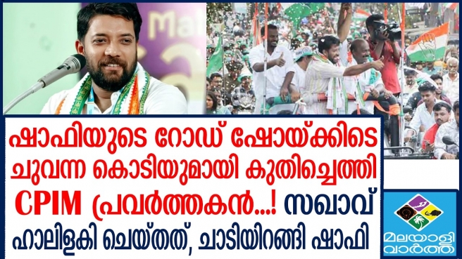 അനൗൺസ്മെന്റ് വാഹനത്തിൽ പോറ്റിയെ കേറ്റിയെ ഗാനം ; ഷാഫി പറമ്പിൽ എംപിയുടെ റോഡ് ഷോയ്ക്കിടെ ചുവന്ന കൊടിയുമായി കുതിച്ചെത്തി സിപിഐഎം പ്രവർത്തകൻ...! പിന്നാലെ സംഭവിച്ചത്