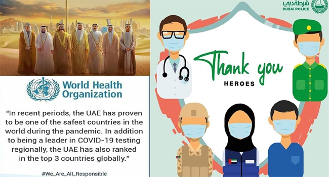 WHO ഇന്നലെ പുറത്തിറക്കിയ പ്രസ്താവനയില് ഈ പാന്റമിക്ക് സാഹചര്യത്തില് സുരക്ഷിതമായി ജീവിക്കാന് പറ്റുന്ന ലോകത്തിലെ മൂന്ന് രാജ്യങ്ങളില് ഒന്ന് യുഎഇ യാണെന്നത് സന്തോഷത്തോടെ ഇവിടെ പങ്ക് വെക്കുകയാണ്.