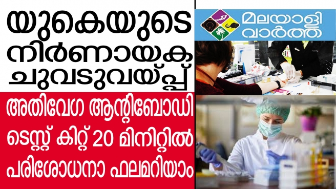 യുകെയുടെ നിര്ണായക ചുവടുവയ്പ്പ് ... കോവിഡ് ആന്റിബോഡി പരിശോധനാ പരീക്ഷണങ്ങളുടെ ആദ്യഘട്ടം വിജയിച്ചതിനു പിന്നാലെ ദശലക്ഷക്കണക്കിന് ആളുകളില് സൗജന്യ പരിശോധനയ്ക്ക് ഒരുങ്ങി യുകെ സര്ക്കാര്, അതിവേഗ ആന്റിബോഡി ടെസ്റ്റ് കിറ്റ്... 20 മിനിറ്റില് പരിശോധനാ ഫലമറിയാം