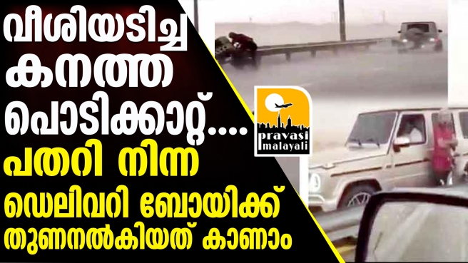 വീശിയടിച്ച് കനത്ത പൊടിക്കാറ്റും മഴയും; അപകടത്തിൽപെട്ട ബൈക്ക് ഡെലിവറി ബോയിക്ക് തന്റെ വാഹനംകൊണ്ട് കവചംതീർത്ത് സുരക്ഷയൊരുക്കിയ സ്വദേശി യുവാവ്, സമൂഹമാധ്യമങ്ങളിൽ തരംഗമാകുന്ന ആ ദൃശ്യം കണ്ട് കയ്യടിച്ച് പ്രവാസികൾ