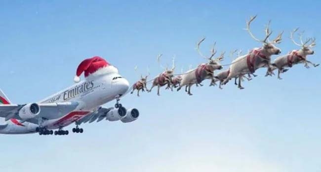 സാന്റാ ക്ലോസിന്റെ തൊപ്പിയും ധരിച്ച് കലമാനുകള് വഹിച്ചോണ്ട് പോകുന്ന എമിറേറ്റ്സ് വിമാനം, സമൂഹമാധ്യമങ്ങളിൽ എമിറേറ്റ്സ് എയര്ലൈന്സ് പുറത്തുവിട്ട വീഡിയോ
