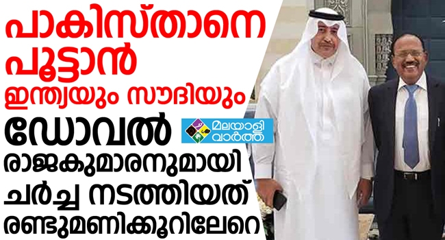 പാകിസ്താനെ പൂട്ടാന് ഇന്ത്യയും സൗദിയും... ഡോവല് രാജകുമാരനുമായി ചര്ച്ച നടത്തിയത് രണ്ടുമണിക്കൂറിലേറെ... കഴിഞ്ഞ മാസം കശ്മീര് വിഷയവുമായി ബന്ധപ്പെട്ട് പാകിസ്ഥാന് പ്രധാനമന്ത്രി ഇമ്രാന് ഖാന് സൗദി രാജകുമാരനെ കണ്ടതിന് പിന്നാലെയായിരുന്നു അജിത് ഡോവലിന്റെ സന്ദര്ശനം