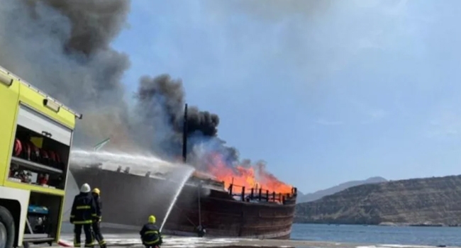 ഒമാനിൽ കപ്പലിൽ വന് തീപിടിത്തം, രണ്ട് ജീവനക്കാര്ക്ക് പരിക്ക്, അപകടം തുറമുഖത്ത് നങ്കൂരമിട്ട തടി കൊണ്ടു നിര്മ്മിച്ച കപ്പലിൽ