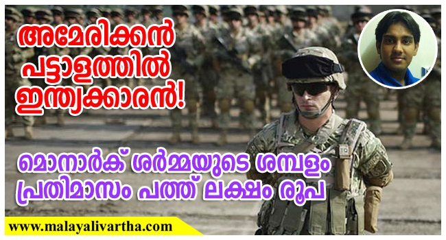 രാജസ്ഥാനിലെ ജയ്പുര് സ്വദേശി മൊനാര്ക് ശര്മ്മയ്ക്കാണ് അമേരിക്കയില് പട്ടാളക്കാരനായി ജോലി ലഭിച്ചിട്ടുള്ളത്. അമേരിക്കന് ആര്മിയിലെ എച്ച്64ഇ പോര് വിമാന യൂണിറ്റില് ശാസ്ത്രജ്ഞനായാണ് മൊനാര്ക് ശര്മ്മയ്ക്ക് നിയമനം ലഭിച്ചത്. ടെക്സാസിലെ ഫോര്ട്ട്ഹൂഡിലെ ആസ്ഥാനത്താണ് നിയമനം.