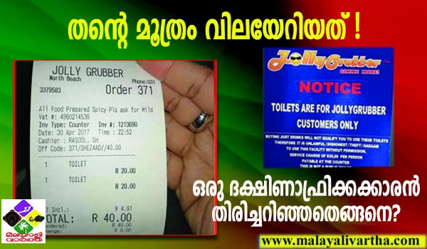 ദക്ഷിണാഫ്രിക്കയിലുള്ള ഒരു ഇന്ത്യക്കാരന്റെ റസ്റ്റോറന്റില് കയറിയ ആളുടെ കമന്റ്:'എന്റെ ജീവിതത്തില് ഞാനൊഴിച്ച ഏറ്റവും വിലയേറിയ മൂത്രം ഇതാണ്'