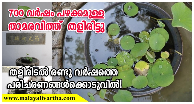700 വര്ഷം പഴക്കമുള്ള താമരവിത്ത് ഒടുവില് തളിരിട്ടു. കിഴക്കന് ചൈനയിലെ ഷാണ്ടോഗ് പ്രവിശ്യയിലാണ് സംഭവം.