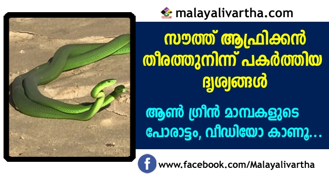 അപകടകാരികളായ ഗ്രീന് മാമ്പകള് തമ്മിലുള്ള പോരാട്ടത്തിന്റെ വീഡിയോ കാണാം